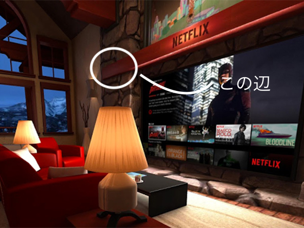 一番左側のソファを選択すると、VRの世界の奥行きのある景色で映画が楽しめる